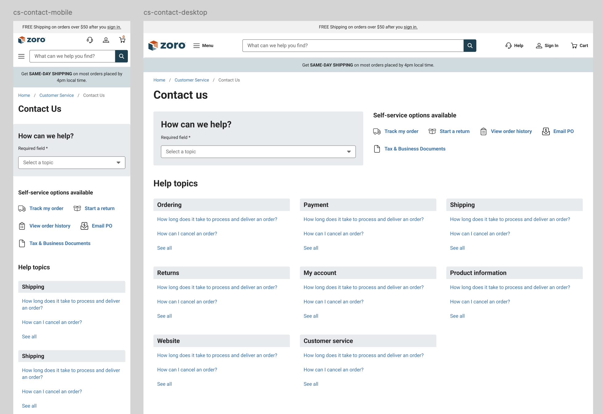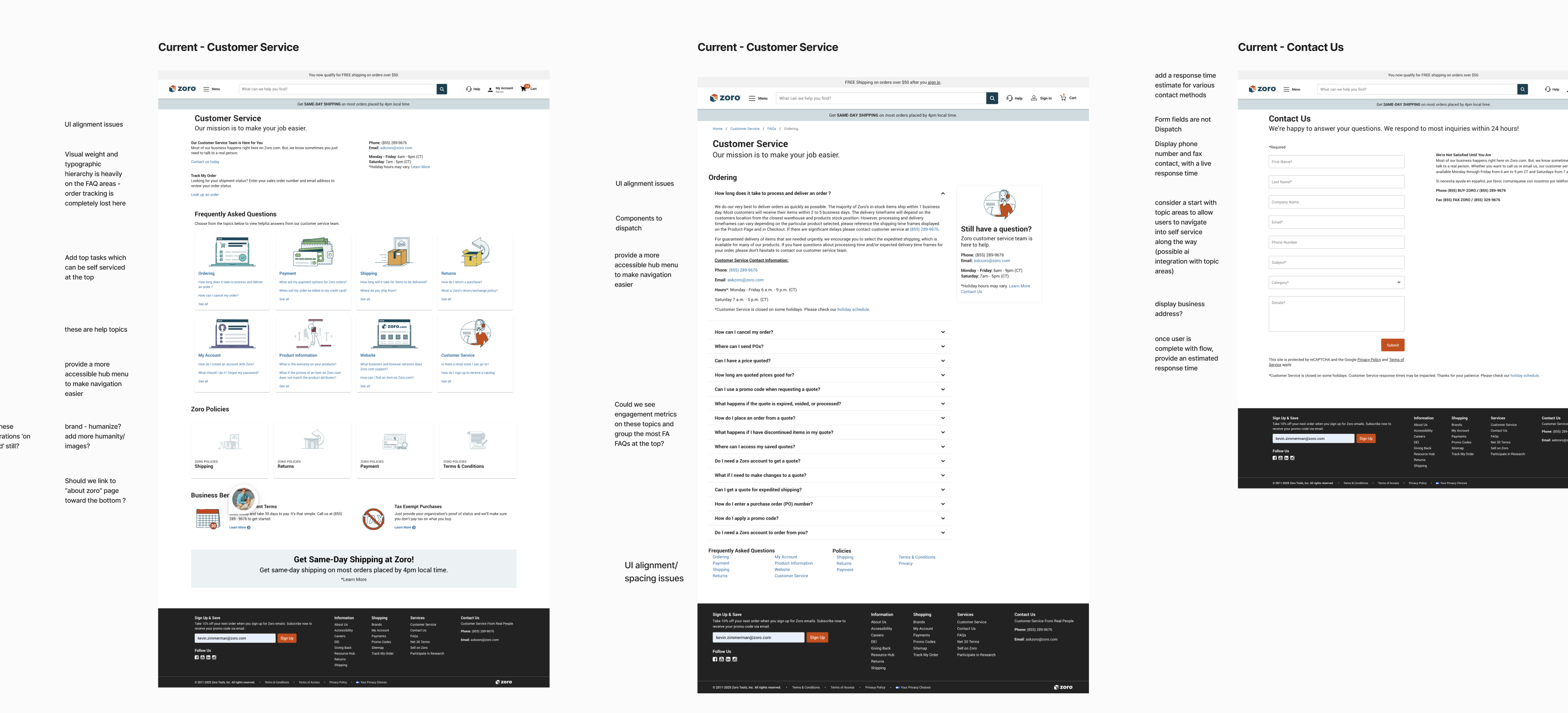To bring the customer service pages into a more modern and branded look/feel, I also applied brand colors and page striping, as well as components and styles from our design system team.