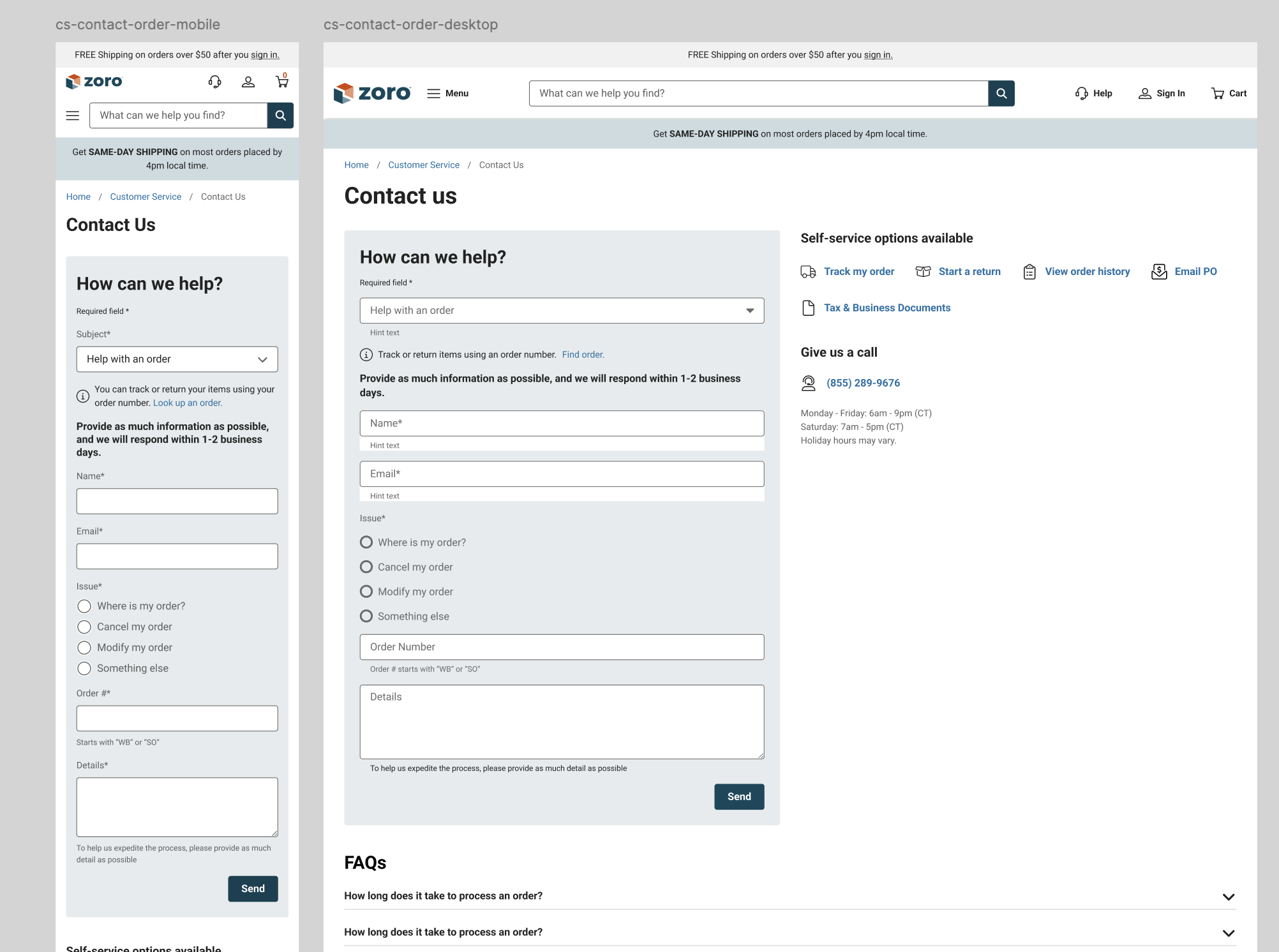 Added prominent links to Track Order, Returns, Quotes, and Order History—redirecting users to self-service before they reached the form.