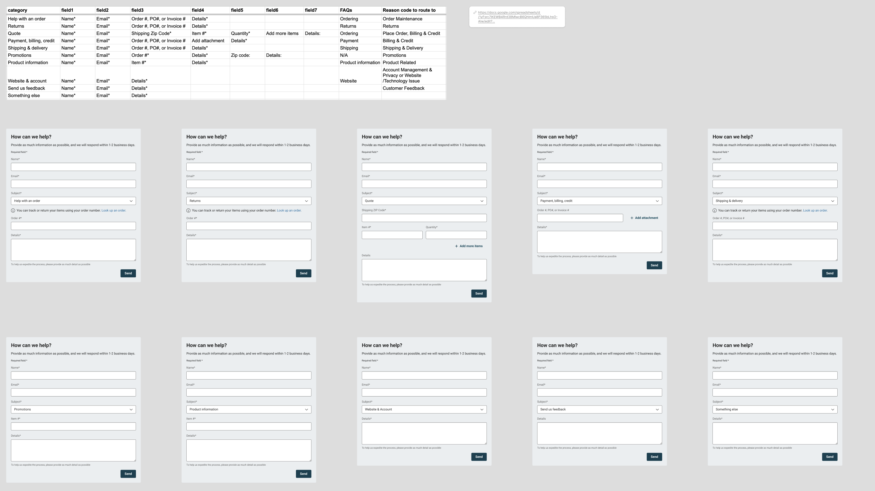 Created a "Subject" dropdown that dynamically populates relevant fields based on selected topic. Only Name, Email, and Subject required; each category surfaces specific information agents need.