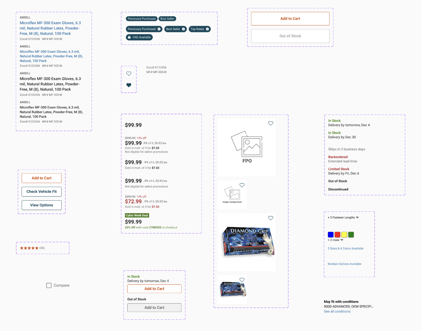Because some card elements belonged to other designers (for example, shipping/delivery messaging was owned by another team), I set up components to cascade their owned elements into the card design.